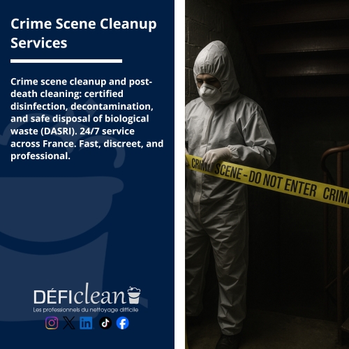 picture Crime scene cleanup and post-death cleaning: certified disinfection, decontamination, and safe disposal of biological waste (DASRI). 24/7 service across France. Fast, discreet, and professional.
